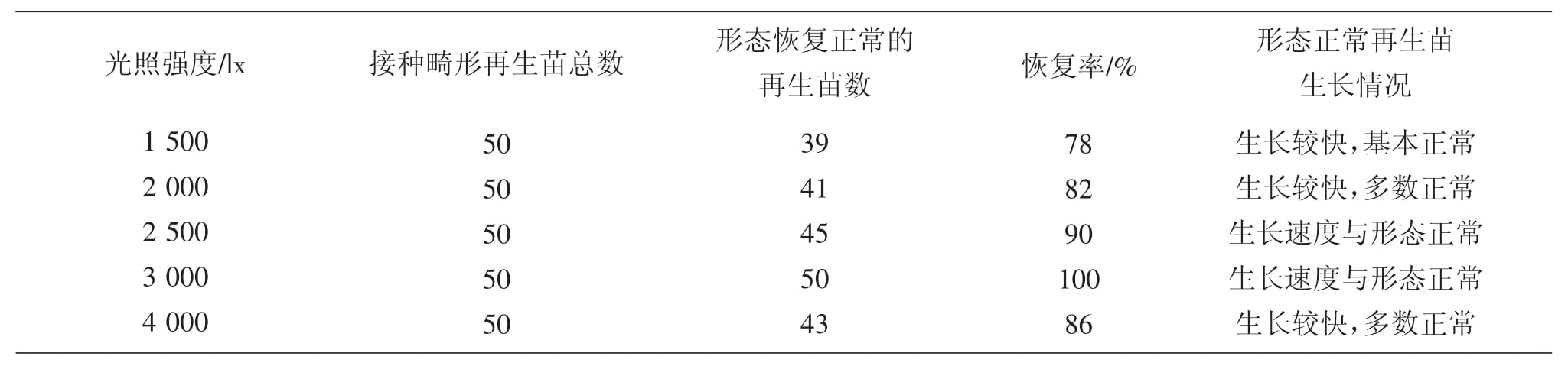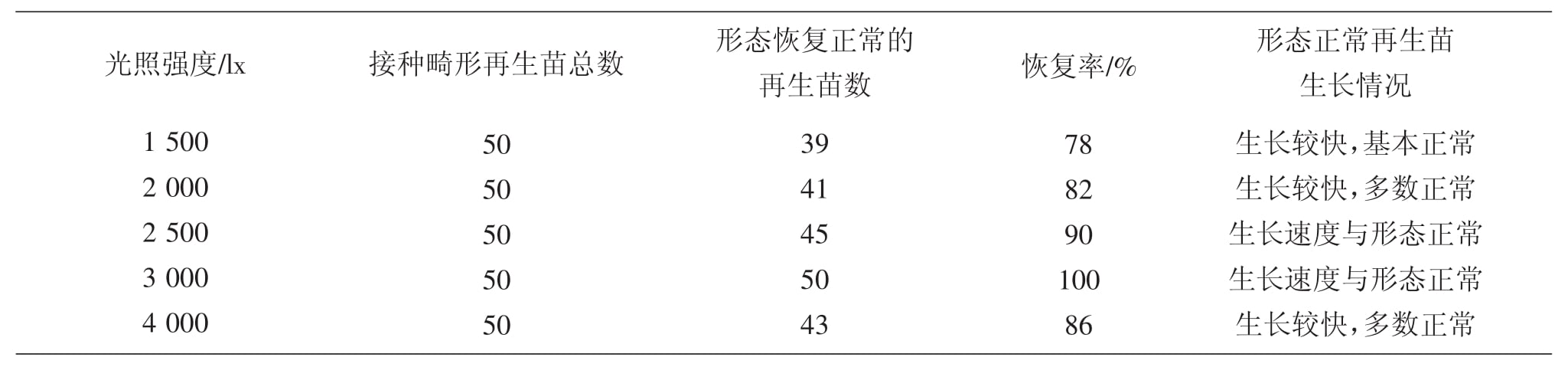 从表2可以看出,冰灯玉露形态正常率较高,原因主要是由于试验采用的培养基为MS附加0.25 mg·L-1的BA,因此,茄子视频成人在线观看苗形态普遍变得较为正常;但在不同温度下,形态正常苗的比例有所不同,当温度为20℃时,获得的形态正常的茄子视频成人在线观看苗数多,而随着温度的增加,茄子视频成人在线观看苗恢复率也逐渐下降,到28℃时,仅有38%。说明冰灯玉露形态建成培养的温度应采用较低的温度。在试验中,也曾采用18℃进行培养,但结果显示,几乎所有茄子视频成人在线观看苗都停止生长,只有个别生长正常,说明过低温度也不利于冰灯玉露茄子视频成人在线观看苗的形态建成。虽然在20℃时可以获得较高的冰灯玉露茄子视频成人在线观看苗的恢复率,但也因温度较低,茄子视频成人在线观看苗生长速度较慢,也不是理想的培养条件。为此,试验又采用不同光照强度来提高形态重建率,希望获得较高、较快的冰灯玉露形态重建培养。