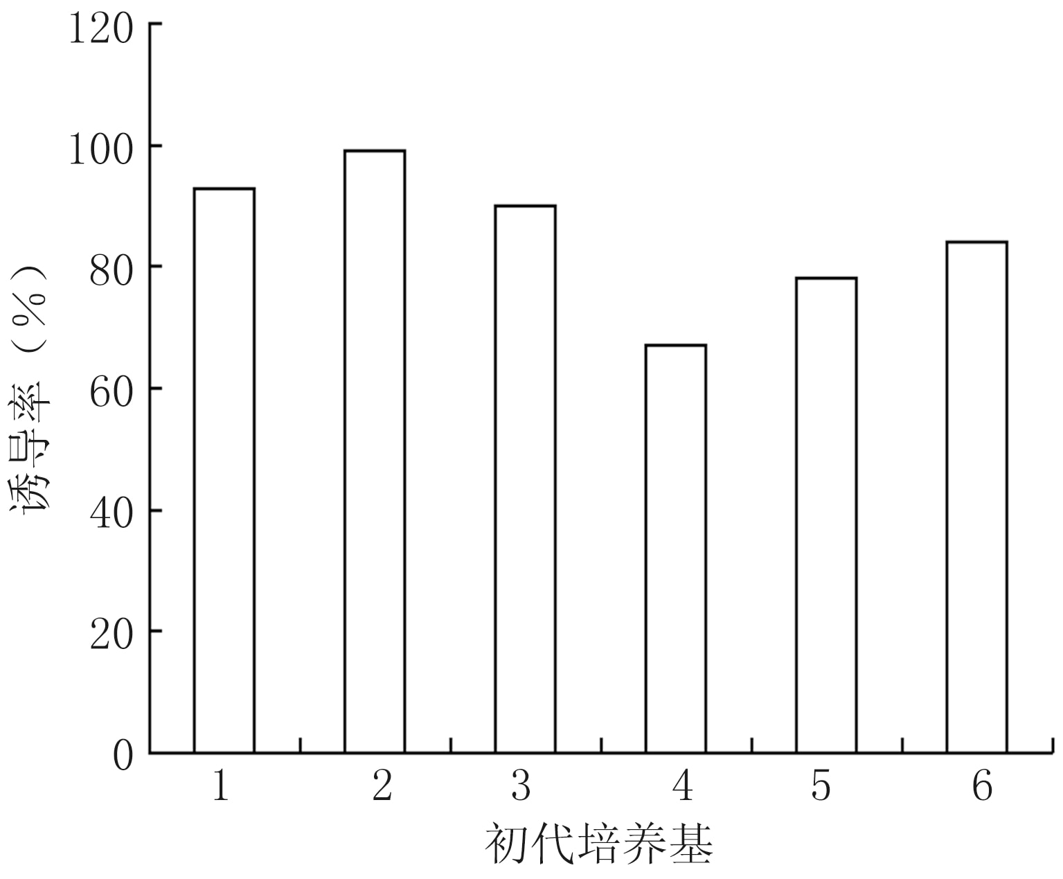 1.2.3 离体茎段诱导与茎蔓生根 将消毒后的离体茎段按照生物学极性方向接种到不同初代培养基配方下,每配方为1个处理,每处理接种6瓶,每瓶接种5~8个茎段。后置于25℃左右、光照12 h/d、黑暗12 h/d的环境下进行培养。1周后观察不同初代培养基处理的茎段腋芽诱导情况并计算诱导率。