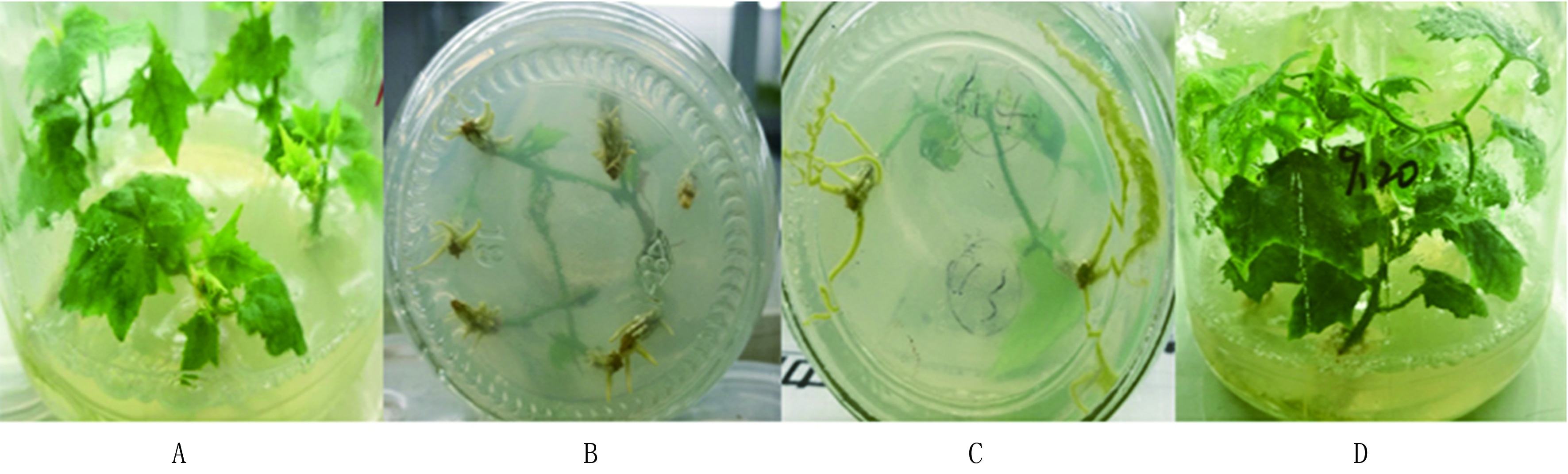 1.2.4 茄子视频成人在线观看苗炼苗与移栽 生根后将茄子视频成人在线观看苗取出,冲洗干净琼脂后移栽到装盆的消毒基质中,淋透1 000倍多菌灵溶液,室温培养,湿度保持在90%以上。1周后湿度降低到70%~80%,喷1次1 000倍多菌灵。待湿度降低到50%~70%,试管苗长出新白根和叶片蜡质层后将苗移栽到大田。