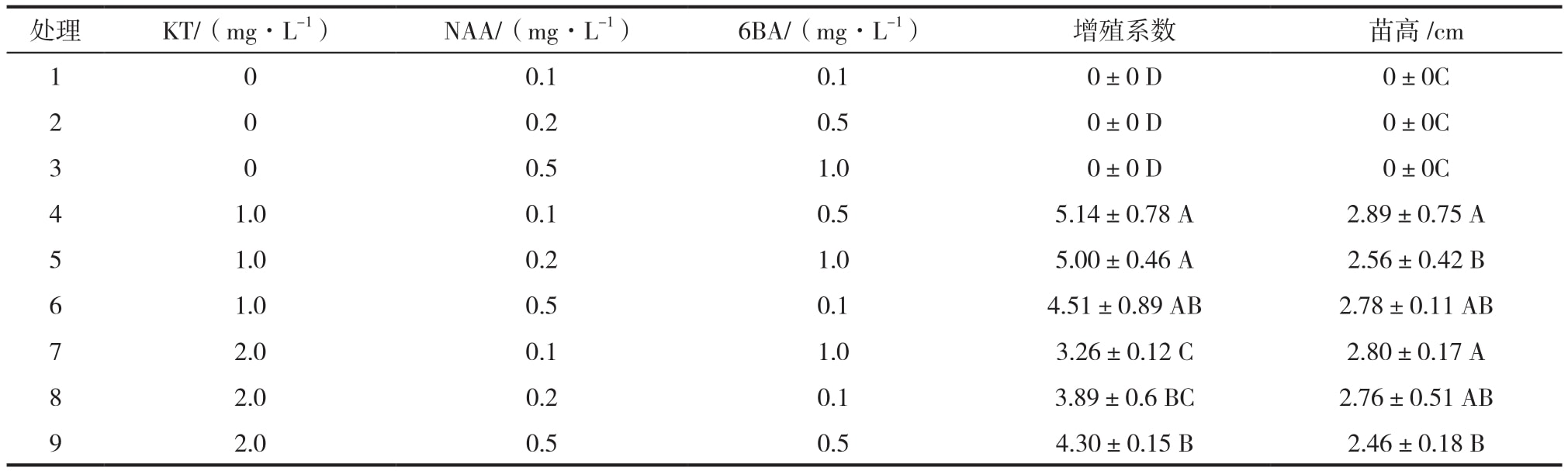 以MS为基本培养基,添加植物生长调节剂KT、NAA和6 BA,KT浓度设定为0、1.0、2.0 mg/L,NAA浓度设定为0.1、0.2、0.5 mg/L,6 BA浓度设定为0.1、0.5、1.0 mg/L。按照正交表 L9( 34) 设计成 9 种不同的处理。将诱导的芽单独切离下来接种到培养基上,每个处理接种30个芽,分别接种在5个培养瓶中,每瓶接种6个芽,重复 3 次。30 d 后调查其增殖倍数和生长情况。