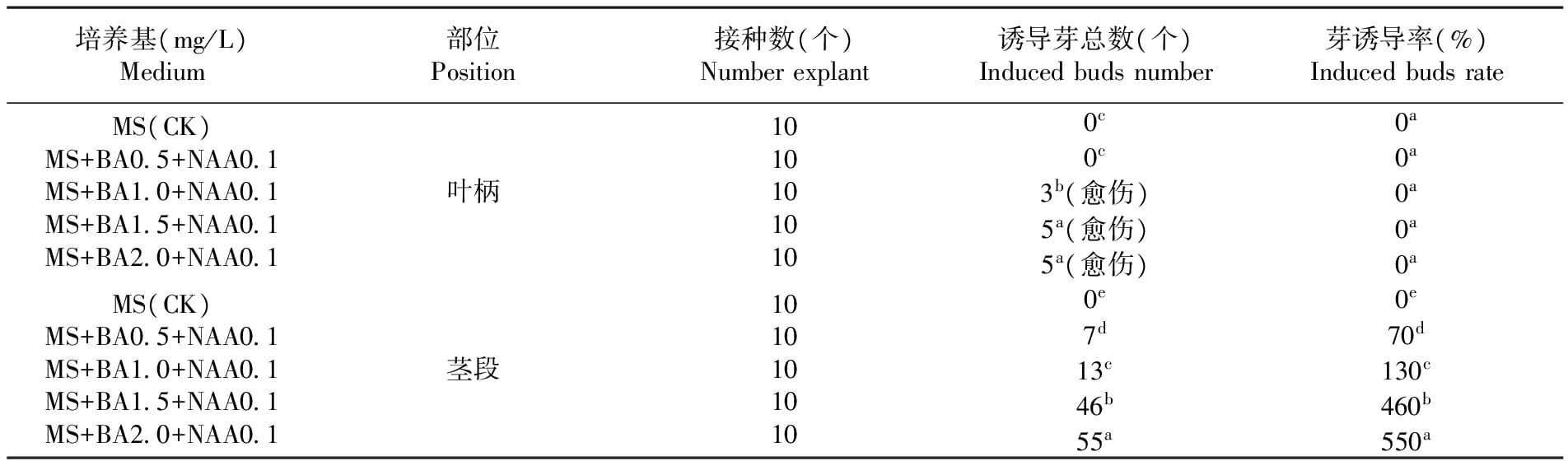 不同部位的外植体,接种于MS+NAA0.1 mg/L添加不同水平BA(0、0.5、1.0、1.5、2.0 mg/L)的培养基中,各接10瓶,每瓶接1个外植体。每天光照12 h,光照强度为1 600~2 000 lx,培养温度25~30℃,接种30 d后统计诱导率。