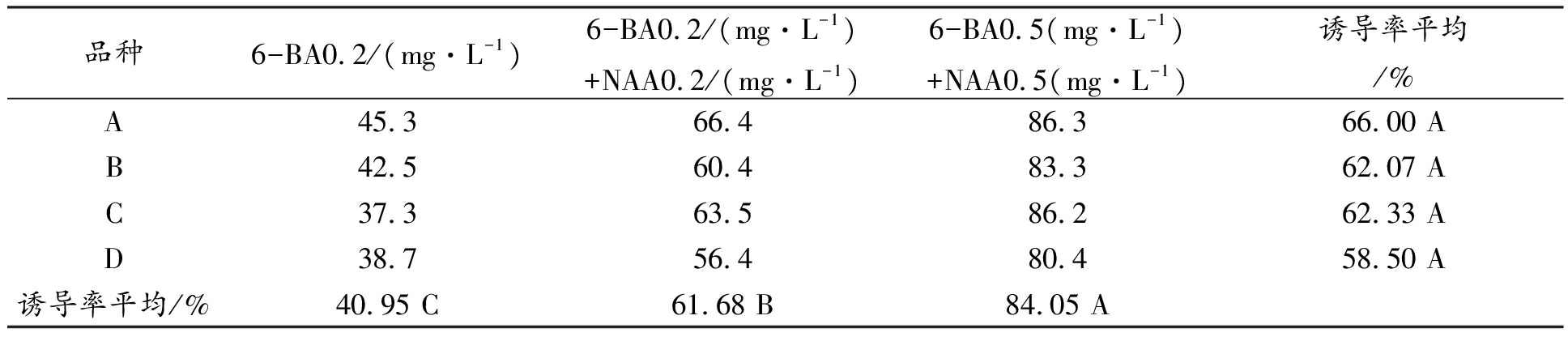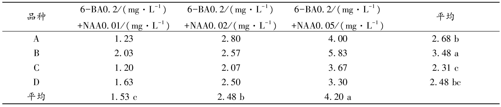统计分析结果发现,品种与激素之间的互作差异显著,进一步分析两因素的互作效应,其中B品种莱姆里奇采用6-BA0.2 mg·L-1 +NAA 0.05 mg·L-1的诱导率最高,可达5.83,C品种“黄桃派”采用6-BA0.2 mg·L-1 +NAA0.01 mg·L-1的诱导效果最差,分析结果见图3。