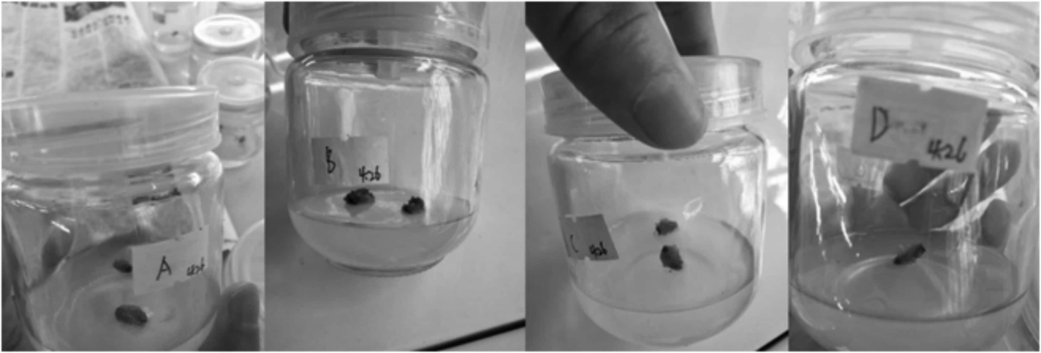 1.2.1 矾根初代培养诱导试验设计从日光温室里种植的四种矾根植株上选取生长健康的茎段作为外植体。用流水冲洗干净,将外植体转入超净工作台,用75%酒精清洗30 s,用无菌水清洗3次后备用。以MS为培养基,添加3种不同激素配方进行培养,共12个处理。接种后置于已灭菌的培养室培养,培养条件温度在25±2 ℃之间,空气相对湿度55%左右。