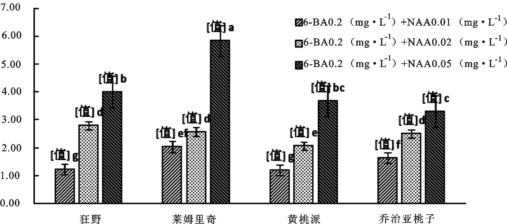 经SPSS 19对品种与激素配方两个因素有重复的统计分析结果表明:品种间差异存在显著差异,其中B品种“莱姆里奇”增殖系数最高,平均可达3.48,A品种“狂野”次之,C品种“黄桃派”和D品种“乔治亚桃子”差异不显著;不同激素配方间差异显著,其中采用6-BA0.2 mg·L-1 +NAA0.05 mg·L-1的诱导率达4.2,效果很好,6-BA0.2 mg·L-1 +NAA0.01 mg·L-1,诱导效果最差,诱导效果见图2。