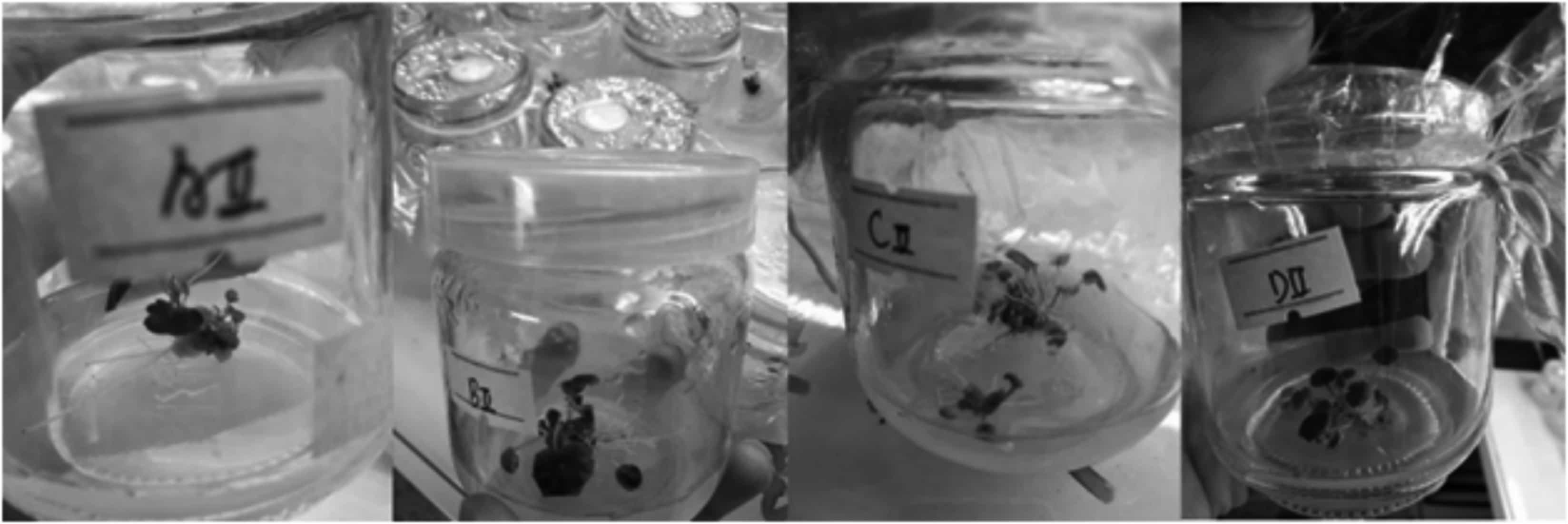 将丛生芽发出较好的的四个品种切分为带3-4片叶的芽簇,接入1/2 MS+IBA 1.5 mg·L-1+NAA 1 mg·L-1培养基内进行培养30 d后四个不同品种生根情况见图4。
