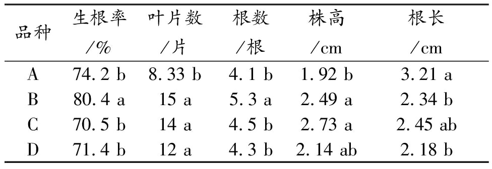 对四个品种的生根等生理指标进行调查统计,结果见表3。表3结果表明,四个品种在1/2 MS+IBA 1.5 mg·L-1+NAA 1 mg·L-1生根率、平均叶片数、平均发根数、株高、根长等有一定差异,其中品种B 莱姆里奇除根长外,其它指标均为很佳,表明此品种采用1/2 MS+IBA 1.5 mg·L-1+NAA 1 mg·L-1效果很好。