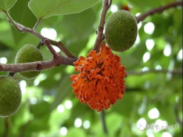 聚花果直径1.5-3cm,成熟时橙红色,肉质;瘦果具有等长的柄,表面有小瘤,龙骨双层,外果皮壳质。花期4-5月,果期6-7月。