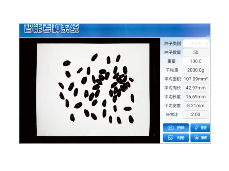 功能特点:1.安卓系统具有操作简洁化,应用人性化、智能化和可升级化等优点。2.可以直接通过拍照实现种子数量计算,手动输入重量计算出千粒重以及平均面积、平均周长、平均长度、平均宽度、长宽比。3.可以直接查看数据报表,也可将所有数据导出excel到电脑,方便用户进行本地数据存储和数据对比分析工作,满足了数据存储的需要。4.具有手动修正功能,确保数粒、重量精度更高。5.背光装置采...